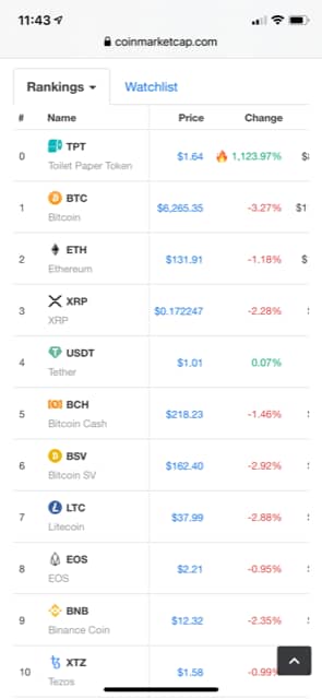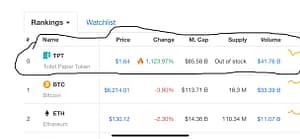 Sitting over the leading cryptocurrency wich we all know is $BTC this $TPT coin has never been heard of before. Come to find out $TPT stands for “Toilet Paper Token”. It was listed at $1.64, The price change was 1,123.97% with a market cap of $85.58. If you were planning to run out and try to buy this coin well..The supply is Out of stock meaning there is no where to purchase this $TPT coin LOL!! It also has an imaginary Volume of $41.76 B.