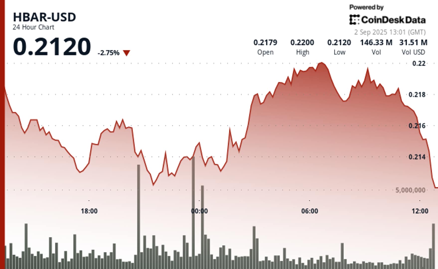 HBAR saw heightened volatility over the 24-hour period from Sept. 1, 09:00 to Sept. 2, 08:00, trading within a $0.013 range that marked a 6% intraday swing between $0.21 and $0.22.